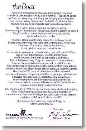 Bill designed the 323 as a coastal cruiser without regard for the IOR ratings. He designed it for comfort, capability and style, targets that he seemingly hit. This is one of the reasons why the 323 and most other Pearson's are still being enjoyed, and treasured, by their owners today. With the 323 he set about to design an honest cruising boat with youthful ideas and an international flavor. See the words of Bill Shaw himself below in "the Boat"